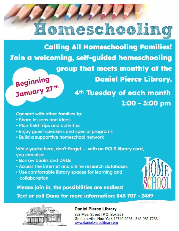 We invite all homeschooling families to join a self-guided group that meets monthly at the Daniel Pierce Library.