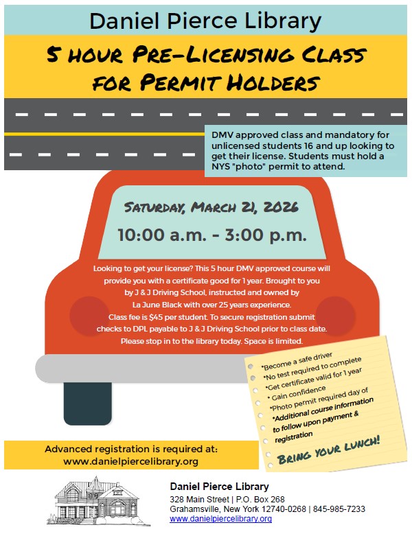 Class fee is $45 per student. To secure registration submit checks to DPL payable to J & J Driving School prior to class date.